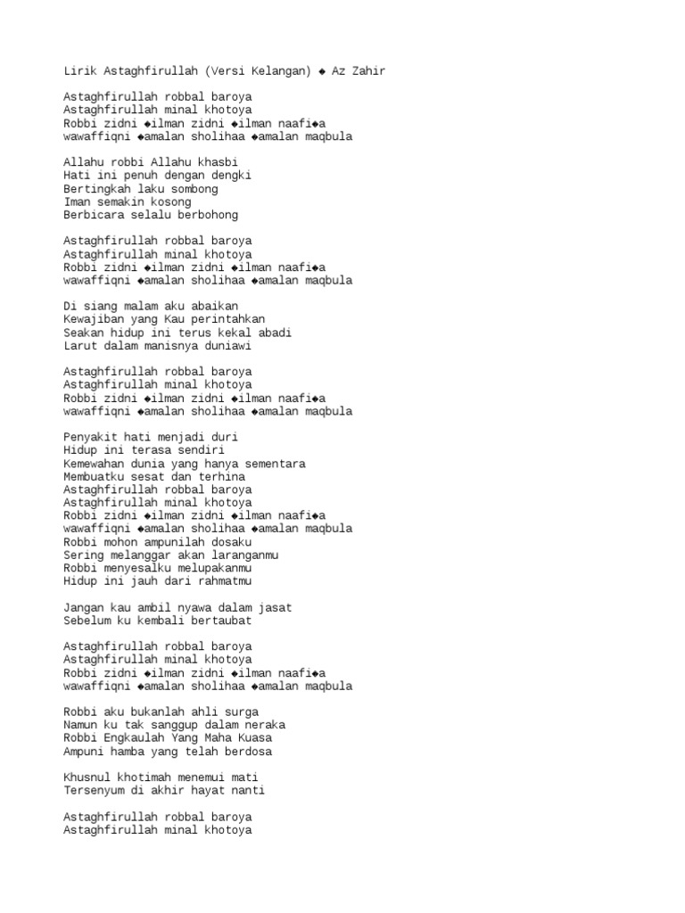 Chord Astaghfirullah Robbal Baroya Di siang malam aku abaikan Kewajiban yang Kau perintahkan Seakan hidup ini terus kekal abadi Larut dalam manisnya duniawi. Maap kalo salah pengucapan nya Lirik lagu. Taubatan nasuha sendiri artinya adalah taubat atau kembali ke jalan.