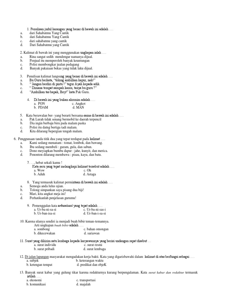 Karena terjadi perbedaan pendapat kelompok pemuda itu. Senang tertawa manis pembicaraan e. Penulisan bilangan tiga ratus tiga belas adalah.