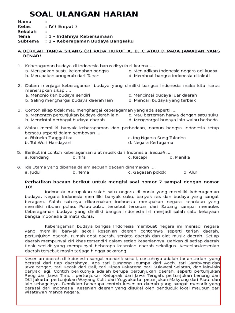 Soal K13 Kelas 4 Sd Tema 1 Subtema 1 Keberagaman Budaya Bangsaku